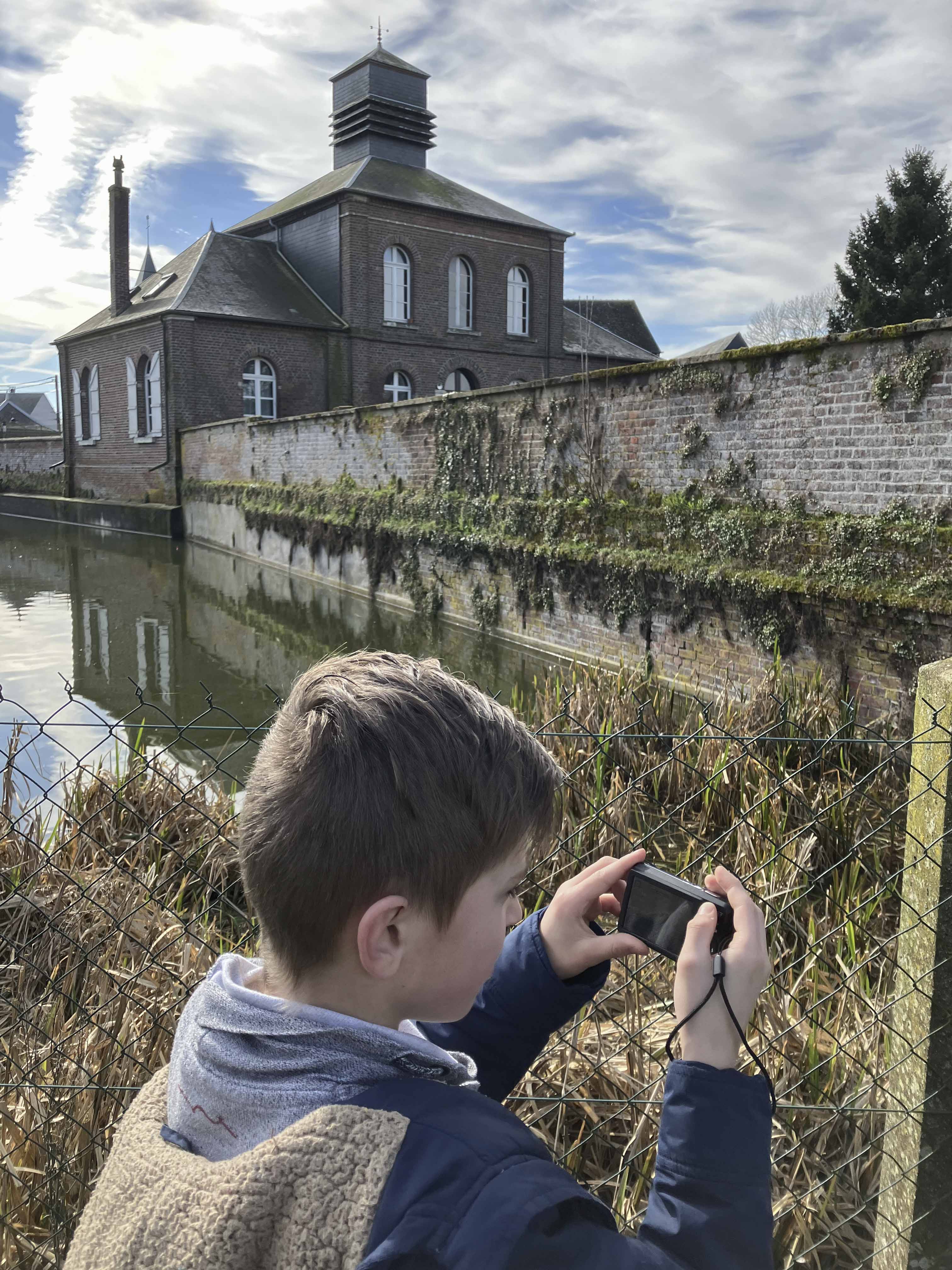 L’école se trouve au centre de la commune près d’une marre, on peut y voir quelques tortues me précise un élève. Le bâtiment est typique des architectures classiques des mairies, bâtiments communaux du 19ème, façade particulièrement intéressante avec ses briques et son entrée. Comme les autres classes, je leur parle de l’histoire du procédé photographique, nous prenons en main différents matériels.